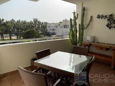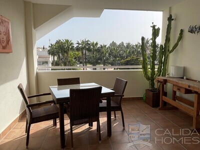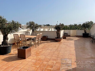 Apartment Views A Beautiful immaculate penthouse (89m2) on the second floor in Vera playa, Puerto Rey. The apartment consists of an entrance hall, an independent kitchen (fully refurbished in 2019), fully equipped with appliances and natural stone worktop and access to a separate laundry room. There are 2 double bedrooms (both with fitted wardrobes), a single bedroom and a bathroom with large walk in shower. The spacious and bright lounge has quality sliding doors with access to the south facing terrace. This south facing terrace has fantastic open views over the gardens of the complex. The apartment also boosts a very private roof terrace of 82m2 with sea views. With its outdoor kitchen this is the place to be in summer and winter!