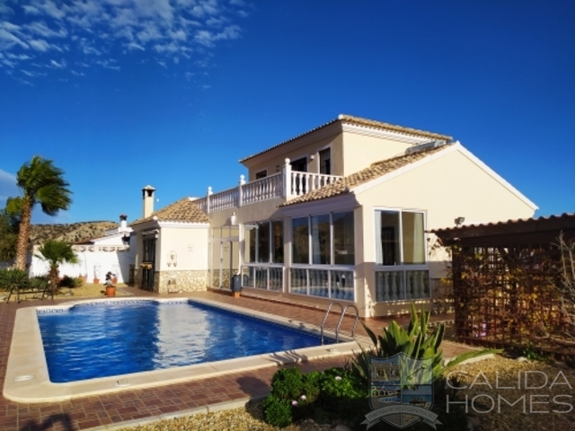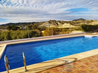 This impressive villa is set in private corner gardens that overlook the rambla ( so afford amazing views) in the small but established community of Los Menchones. Arboleas centre is within walking distance ( 20 mins) and just a 1 min drive, Arboleas offers much of the amenities required for day to day living including an excellent supermarket, a general store, pavement tapas bars, new medical centre, chemist, post office, banks, 3 gyms, hairdressers ( all with English Speakers) etc and a weekly street market on Saturdays. The med coast resorts of Vera Playa, Garrucha etc can be reached within 25 to 30 minutes and there are three airports within easy commute via excellent motorway connections, Almeria, Murcia and Alicante.