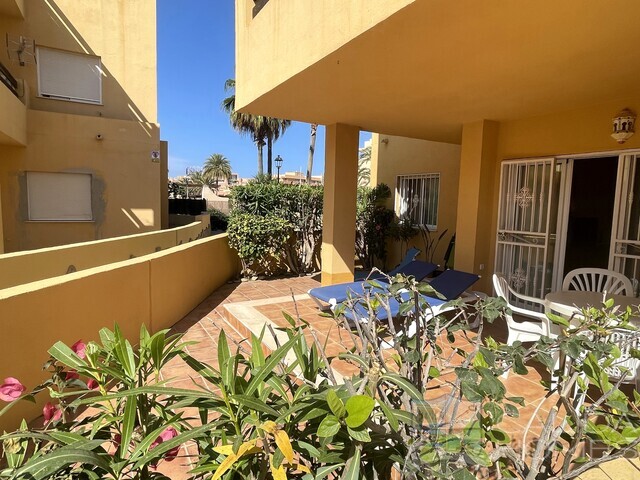 Apartmento Terraza – A very spacious 88sqm 2 bedroom, 2 bathroom ground floor corner apartment within a complex and only 400 mtrs from the beach. There is a magnificent 26sqm SW facing terrace plus an additional terrace to the rear. There is a spacious lounge/diner, fitted kitchen, fitted wardrobes, air conditioning, marble floors, sold furnished, private parking, 2 x communal swimming pools, landscaped communal gardens and a children’s playground.