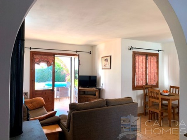 This very pretty two bedroom, two bathroom semi detached bungalow, located on a very small community with a communal pool (only 4 owners). It is located just a few minutes’ walk from the fabulous Mojacar Playa and within easy walk of many bars, restaurants bars and several shop. You have a fantastic bus service running along the playa connecting both to Mojacar old town and the neighbouring Garrucha.