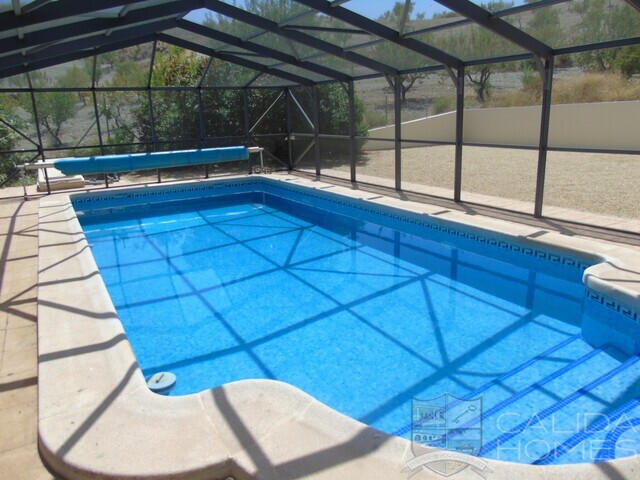 At the other side of the property is the fully tiled flyfree enclosure with the 8x4 m swimming pool, outside the fly free there is a matching fully tiled area which provides a great space for sun bathing with loungers and a seating area, this is a super terrace on which to enjoy wonderful outside living in Spain with fabulous uninterrupted 360º views over the surrounding countryside and mountains.