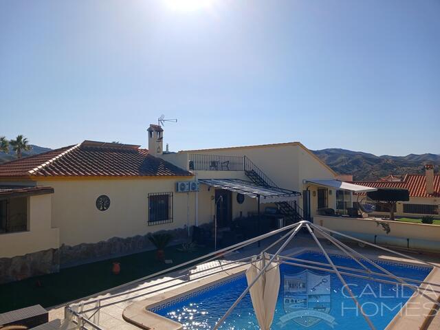 The fully walled, established gardens provide 813 mtrs of space and similar to the villa are beautifully presented - they have been well stocked with yuccas, cactus, fruit trees and some beautiful sculpted Olive trees. There are numerous seating areas (some shaded) and sun bathing terraced or artificially grassed areas from which to enjoy the super views, Large BBQ and Games terrace (off of kitchen) with two extendable sun awnings and a wonderful 8x 4 tiled swimming pool with both Summer and Winter covers. The pool has been encased with a large patio/sun deck from which steps take you up onto a very good-sized roof terrace.