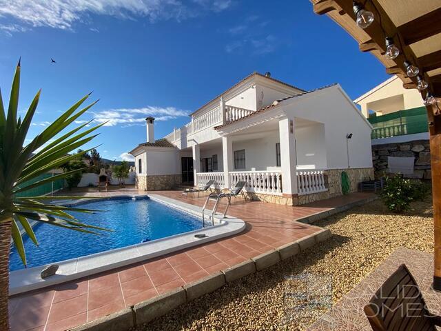 The gardens in which villa constructed provide 657 mtrs of space, provide a delightful, tranquil and easy to maintain outside space. in which to relax in total privacy, soaking up the rays and taking in the outstanding views which you´ll never tire of. They are accessed via opaque and impressive double wooden gates that open to a very good-sized gravelled driveway/parking area with ample room for multiple vehicles or a motor home plus car. This has been bordered with pretty and established yuccas and fruit trees. The main part of the garden runs along the entire villa frontage it incorporates a pristine 8 x 4 tiled swimming pool ( with a heating system that´s not currently connected but could easily be re commissioned) encased by a sizeable sun bathing terrace that houses a traditional Spanish BBQ ideal for those pool side parties. There is a large 2nd terraced area with a lovely wooden pergola that provides a fabulous outside dining/relaxation area. The rest of the garden has been very well maintained and provides ample space within in its feature stone walls for additional planting or perhaps if required a summer kitchen/bar.
